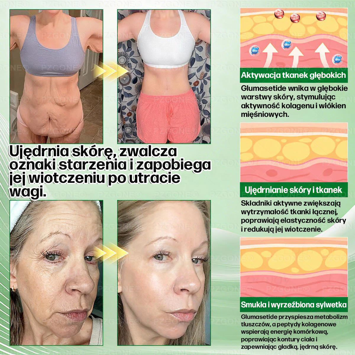 Szybka utrata masy ciała często prowadzi do luźnej, obwisłej skóry oraz wyraźnego spadku jej elastyczności. 𝐏𝐙𝐆𝐎𝐍𝐄® rozwiązuje ten problem, wzbogacając formułę o peptydy kolagenowe oraz czynniki stymulujące produkcję kolagenu, które pomagają przywrócić jędrność i grubość skóry. Kluczowe składniki pobudzają syntezę kolagenu i elastyny, napinają skórę, wygładzają drobne linie, redukują opadanie i przywracają młodzieńczy, zdrowy blask. Dzięki temu nie tylko skutecznie chudniesz — ale też zachowujesz jędrną, młodo wyglądającą sylwetkę bez efektu „szczupły, ale starszy”. Odchudzanie i odmładzanie zachodzą jednocześnie.Formuła została dodatkowo wzmocniona potężnymi cząsteczkami o działaniu przeciwstarzeniowym i ujędrniającym. NAD⁺/NMN wzmacniają naprawę komórkową i stymulują produkcję kolagenu, zapewniając korzyści anti-aging; Omega-3 zatrzymują wilgoć dla długotrwałej gładkości; zielona herbata, kurkuma i moringa dostarczają silnej ochrony antyoksydacyjnej i przeciwzapalnej; magnez pomaga w regeneracji i głębokim nawilżeniu skóry; a sylimaryna detoksykuje, rozjaśnia i wspiera klarowność cery.Ta zaawansowana, synergiczna mieszanka nie tylko zapewnia działanie przeciwzmarszczkowe i przeciwstarzeniowe, ale także wspiera odbudowę wiotkiej skóry po utracie wagi — pomagając przywrócić jej jędrność, elastyczność i odporność. Potwierdzone klinicznie: już po 4 tygodniach ponad 82% użytkowników doświadczyło lepszego nawilżenia, wygładzenia drobnych linii, wyraźnie jędrniejszej skóry oraz efektu uniesienia — odzyskując młodzieńczy, wyrzeźbiony wygląd nawet po znacznej utracie masy ciała.