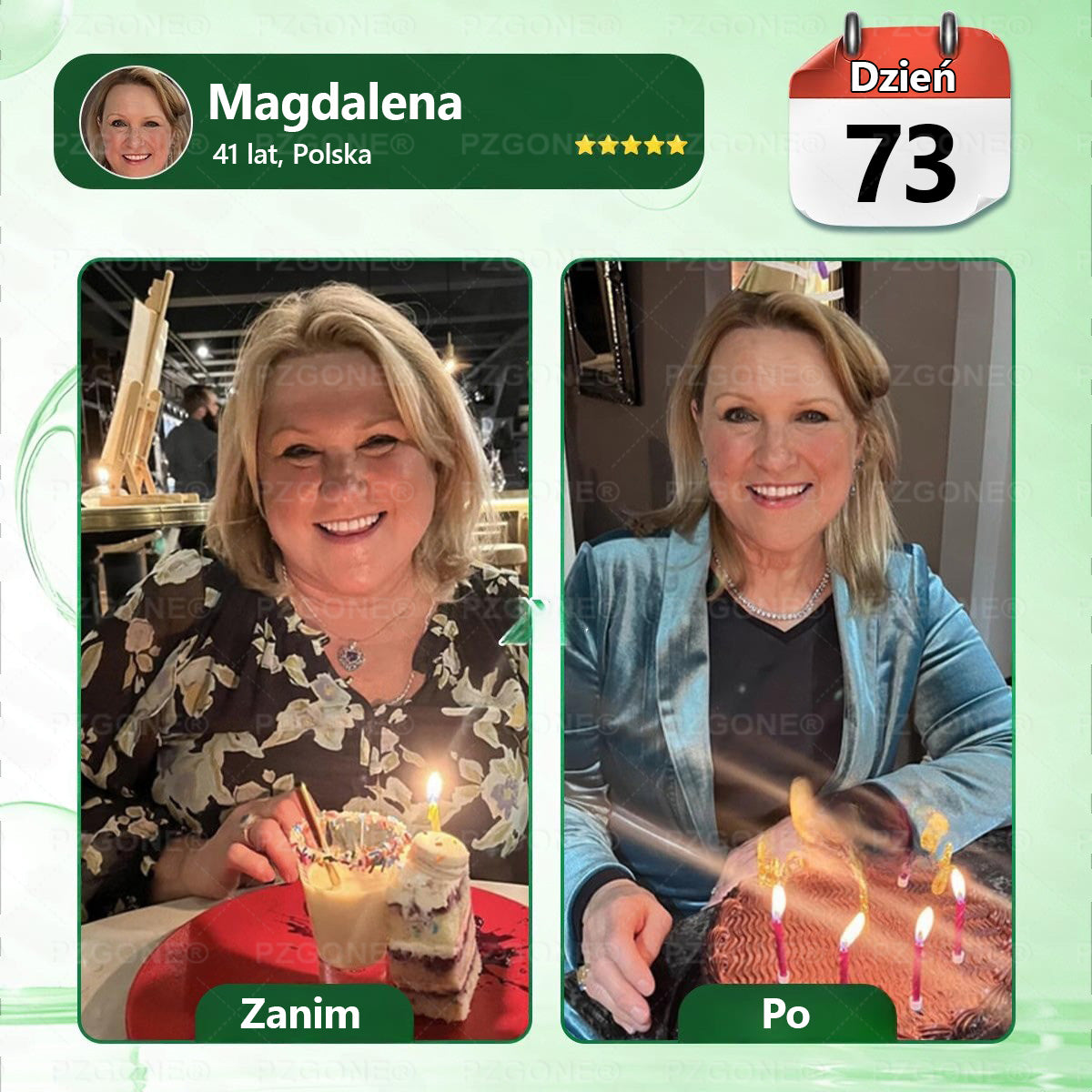 Po dwóch miesiącach wróciła energia. Zaczęłam znów chodzić na wieczorne spacery. Cztery miesiące później — 65 kg mniej, waga spadła do 56. Moja skóra nie stała się obwisła i luźna, jak można by się spodziewać przy tak szybkiej utracie wagi. Jestem naprawdę zadowolona z tego, jak jędrnie wszystko się utrzymało. Nadal pracuję jako pielęgniarka, ale teraz dbam też o siebie. Pacjentom zmagającym się z nadwagą zawsze mówię: nigdy nie jest za późno, by odzyskać zdrowie.”— Zofia, 31 lat, Polska
